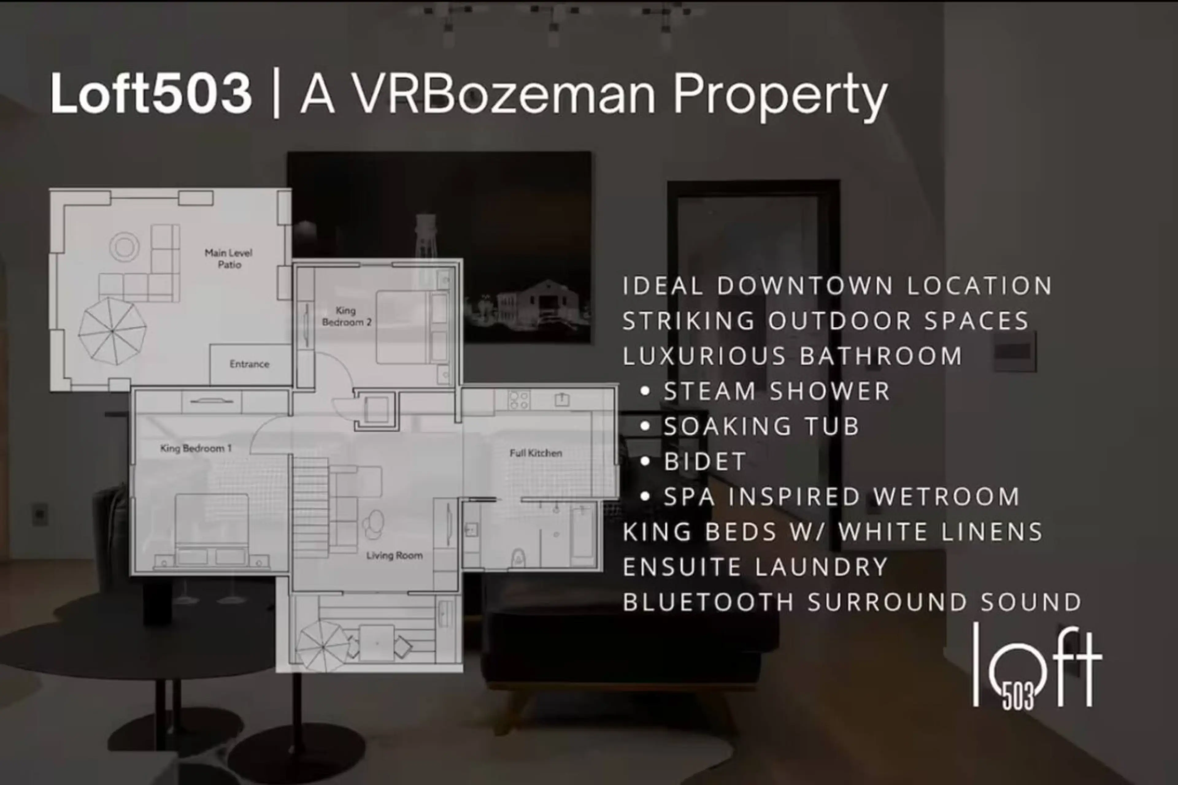 This unique listing features two elegant side-by-side condos, Loft503 and NamaStay, offering the perfect mix of privacy and connection for groups. Just one block from Main Street, enjoy easy access to Bozeman’s best dining, shopping, and nightlife. Designed for relaxation and adventure, these stylis...